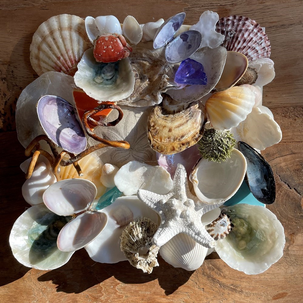 Sculptural and rich display of foraged shells, glass, seaweed, ceramic pieces and sea creatures.