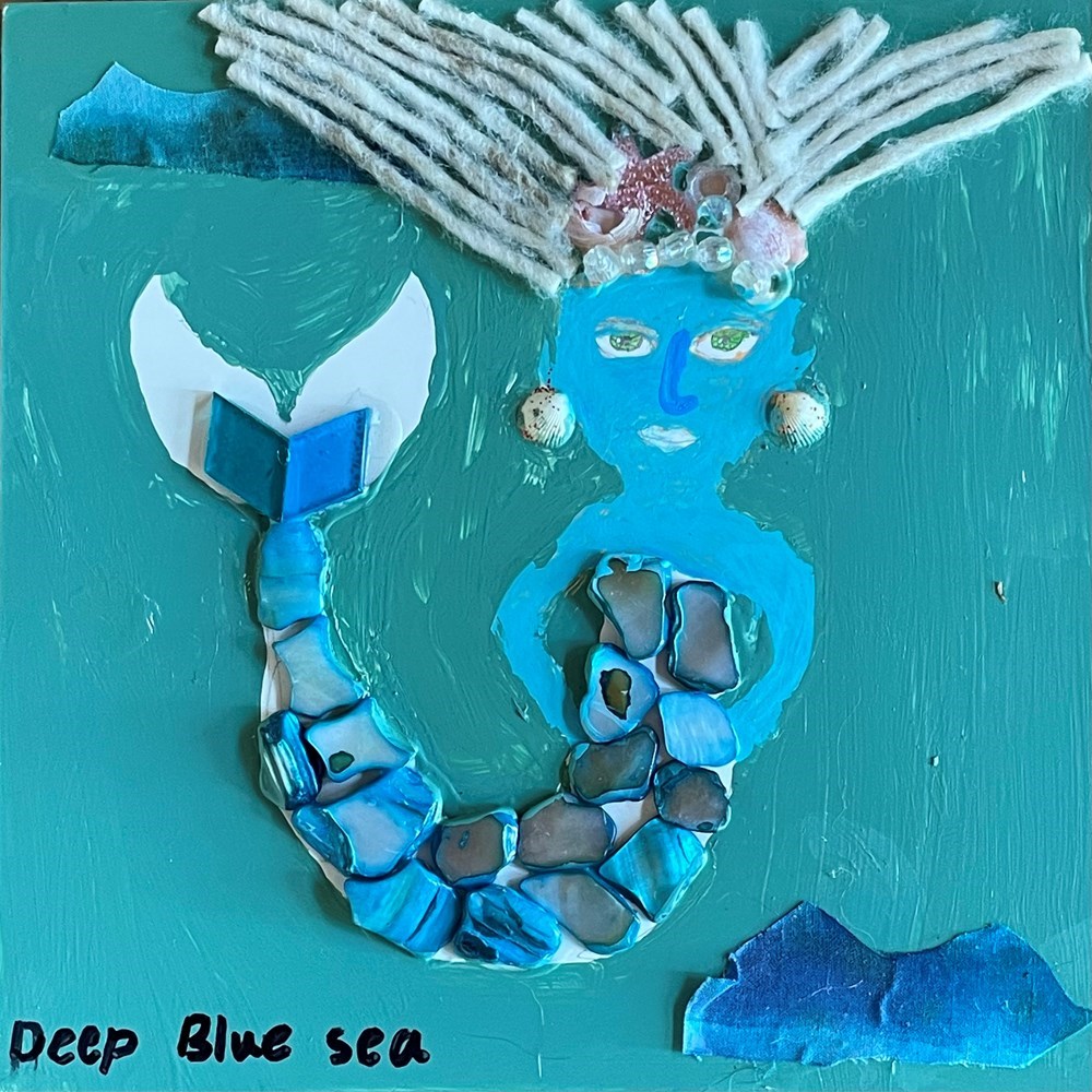 Mixed media art piece featuring glass and shell pieces to form a regal mermaid with piercing green eyes and shell earrings.