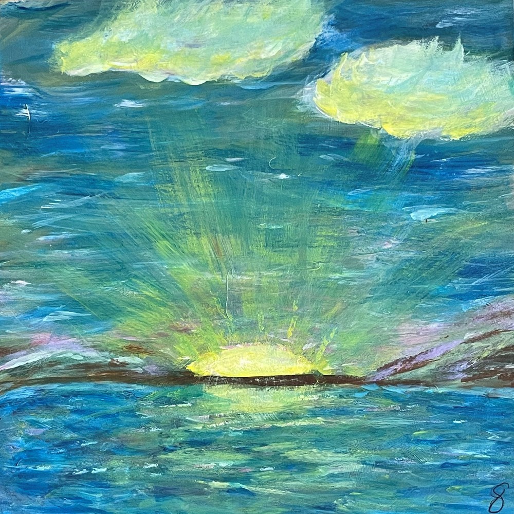The rising sun heralds the start of another brilliant Lummi day. Textured blues and yellows bring the sky and sea to life.