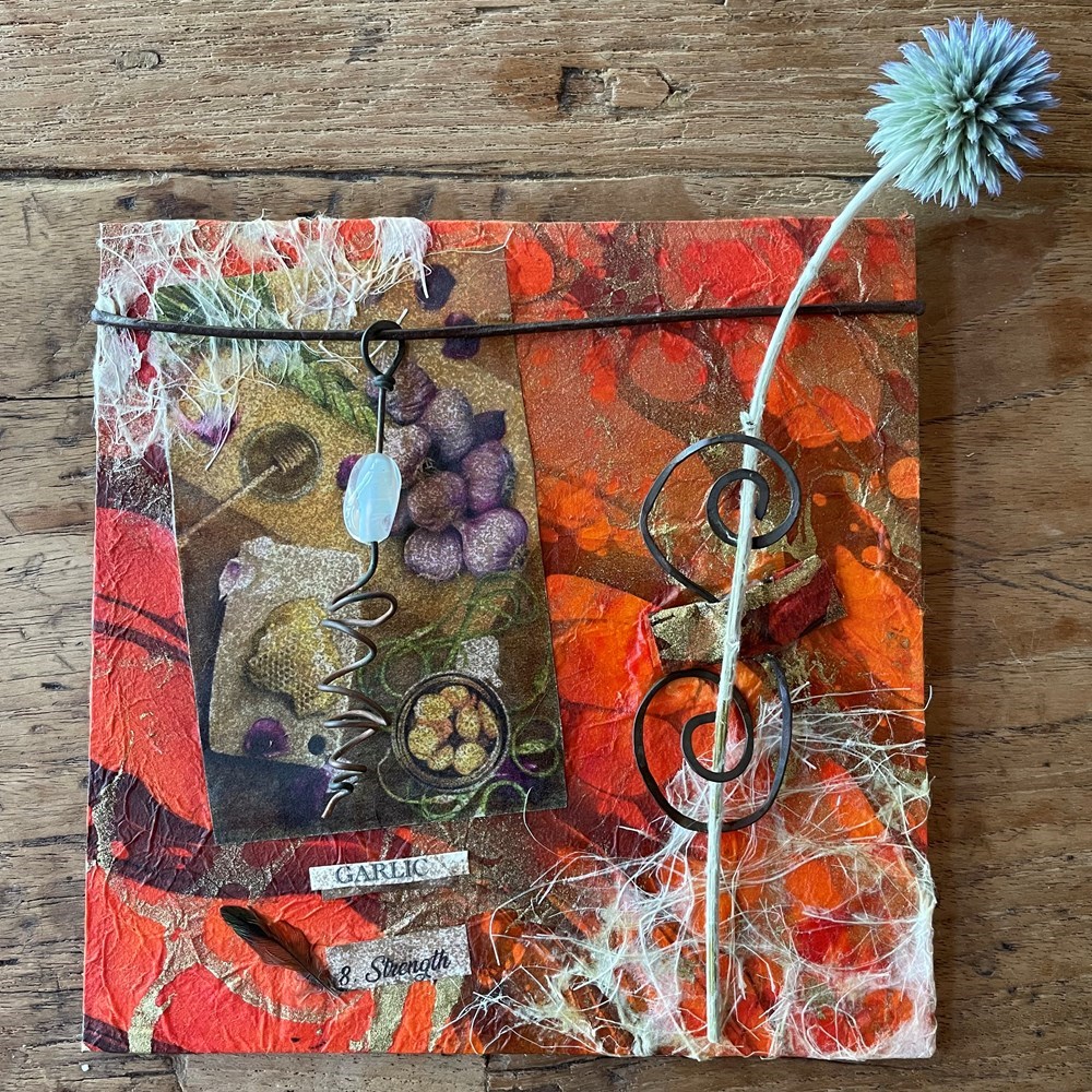 Collage. Herbcrafters Tarot: 8 Strength/ Garlic. Handmade paper, feathers, leather, walnut ink, thistle, repurposed objects.