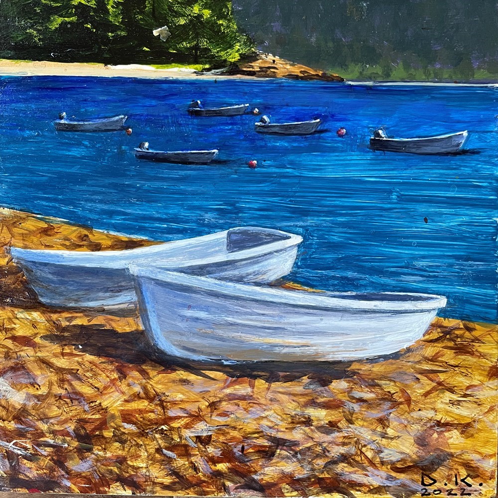 Skiffs in a secluded PNW bay - some moored in the water, two pulled onto the beach. An evocative gem.