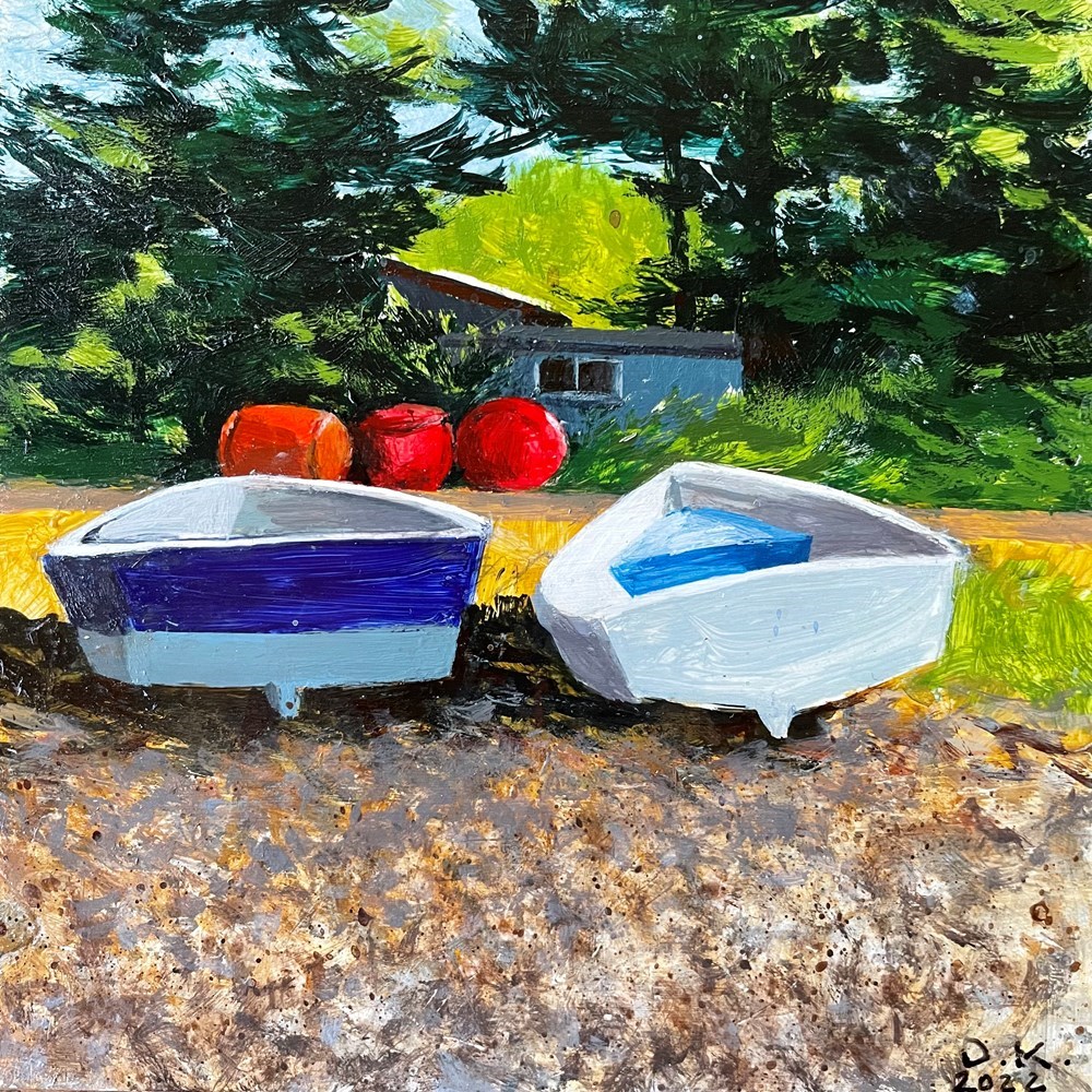 Two skiffs pulled high up on the beach, vermilion buoys, an evergreen backdrop.