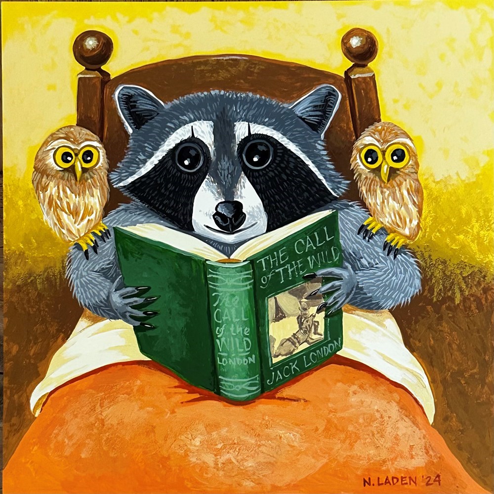 Children’s book author and illustrator Nina Laden continues her “Critters Reading Series” with "Raccoon Reading "The Call of the Wild" to Two Pygmy Owls.” Painted with Holbein Acryla Gouache.
