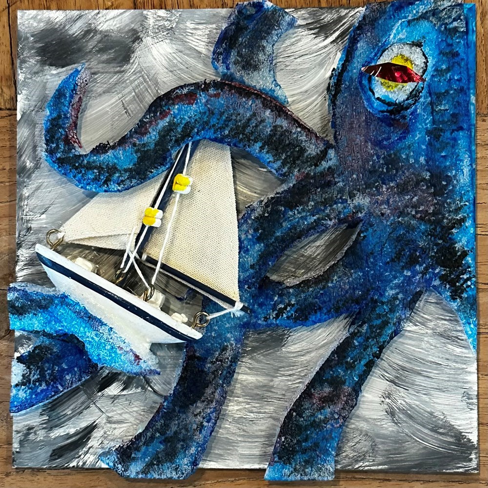 For the first 6X6 fundraiser I made a tile with an octopus attacking the ferry. This new tile is a continuation of their territorial war.