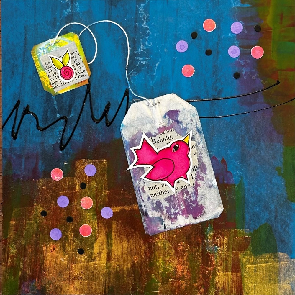 Vibrant collage on painted background.